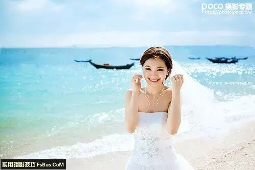 在测光模式方面,你的相机提供了多个选择。其中包括了中央重点测光、平均测光、局部测光、多区测光以及点测光等。而点测光模式,让你根据现场环境,能够针对所选择的拍摄对象上很小的局部区域进行精确、独立的测光。在光线不均匀的条件下(背景与主体人物之间的亮度差异非常大的情况点测光有着非常大的优势)。在白纱以及海水、沙滩的情况下,你可以使用点测光模式仅仅对拍摄人物主体进行测光。
