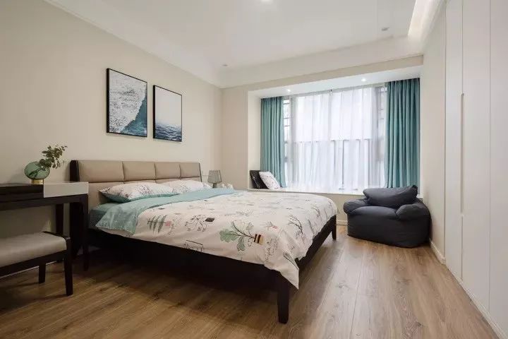 这个卧室比较小,所以将床头靠近窗台,没有床头柜,安装了节省空间的推拉门式衣柜,看起来也十分干净利落。